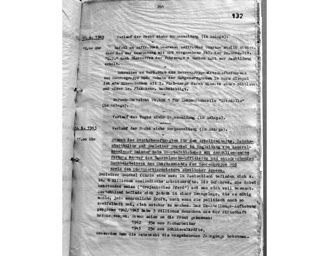 11:00. Посещение рейхскомиссара по рабочей силе, губернатора и гауляйтера Заукеля в сопровождении генерального комиссара Зельцнера и доклад перед офицерами Генерального штаба и сотрудниками командования группы армий «Юг» а также главных квартирмейстеров подчинённых армий. Гауляйтер Заукель доложил следующее: