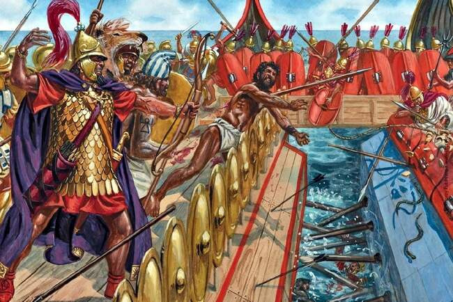 Битва при Милах: римляне по штурмовому трапу-ворону врываются на палубу карфагенского корабля. Между сцепившимися бортами кораблями идёт обмен дротиками и стрелами