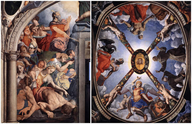 Однако Аньоло Бронзино известен не только своими портретами: он создавал еще и фрески на религиозные сюжеты. На это его вдохновил Микеланджело, с которым он встретился в Риме. Художник пытался подражать знаменитому мастеру, но на всех фресках, которые сохранились до наших дней, можно увидеть ту же холодность и бесстрастность, что и на портретах.