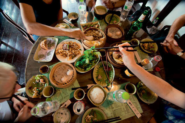 В традиционных семьях принято вместе готовить, любоваться пищей и есть. Во время обеда все блюда с общими закусками ставятся на середину стола или на вращающийся круг, и участники трапезы успевают насладиться красотой и запахом блюд, прежде чем поднесут к ним палочки.