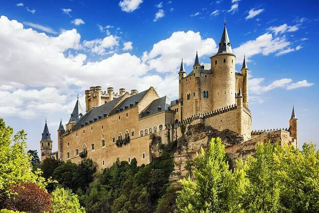 Этот сказочный замок, построенный на крутой скале, величественно возвышается над городом. Алькасар расположен возле места слияния двух рек - Кламорес и Эресмы, на скале, что делает его самым красивым и узнаваемым дворцом во всей Испании. Из замка открывается потрясающий вид на окрестности. Алькасар был построен в 12 веке и первоначально служил резиденцией короля Альфонсо VIII. В 13 веке замок был перестроен для королей Иоанна II и Генриха IV. Позднее, замок перестраивался еще несколько раз. Последняя переделка здания была закончена в 16 веке. За долгую историю в Алькасаре произошло много исторических событий. Одно из самых значимых - бракосочетание короля Филиппа II с Анной Австрийской.