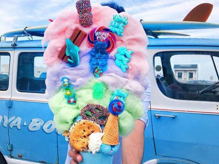 Такого лакомства хватит на большую компанию друзей. Мороженое приготовлено из 900 г молочного коктейля и дополнено конфетами, леденцами и другим.