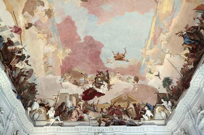 Рассмотрим, к примеру, его фрески во дворце князей-епископов, Вюрцбургской резиденции. Тьеполо пришло приглашение от франконского епископа Грейфенклау. Соблазненный гонораром и масштабом проекта, он тут же отправился в переход через Альпы на Юг Германии, в федеральные земли Баварии, в город Вюрцбург.
