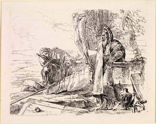 Рисунки Тьеполо выделяются по тому же принципу, что и большие полотна - они наполнены светом и воздухом, создается ощущение тонкой игры цвета и полутонов, хотя это лишь карандаш, уголь и тушь. Офорты Тьеполо также пользовались заслуженным вниманием. Особенно известны два цикла: "Вари Каприччи" (всяческие причуды) и "Скерци ди фантазия" (шутки фантазии).