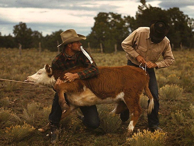 Привязывание ленты на хвост теленка перед родео в Пай-Тауне, октябрь 1940 года