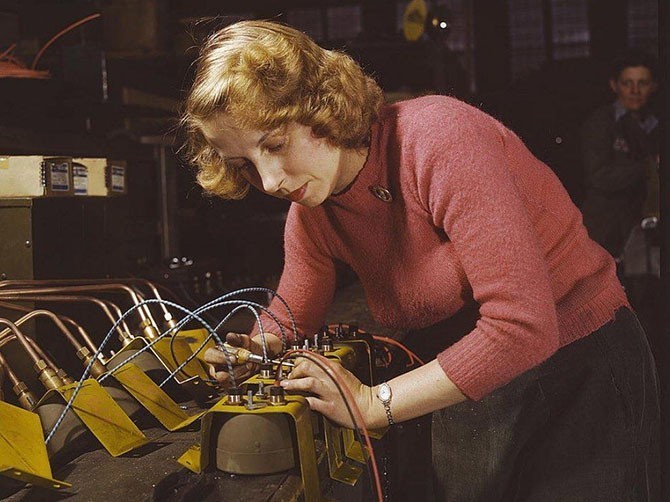 29-летняя Люсиль Мазурек, бывшая домохозяйка, чей муж был призван в армию, работает на заводе в Милуоки, штат Висконсин, февраль 1943 года. Фотограф Говард Холлем