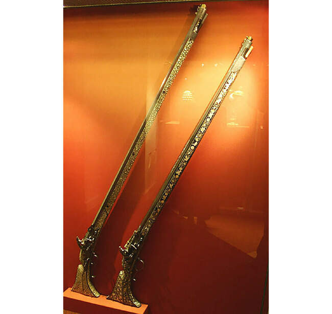 Пара парадных мушкетов, подаренных англичанами царю Михаилу Федоровичу в 1626 году на свадьбу.