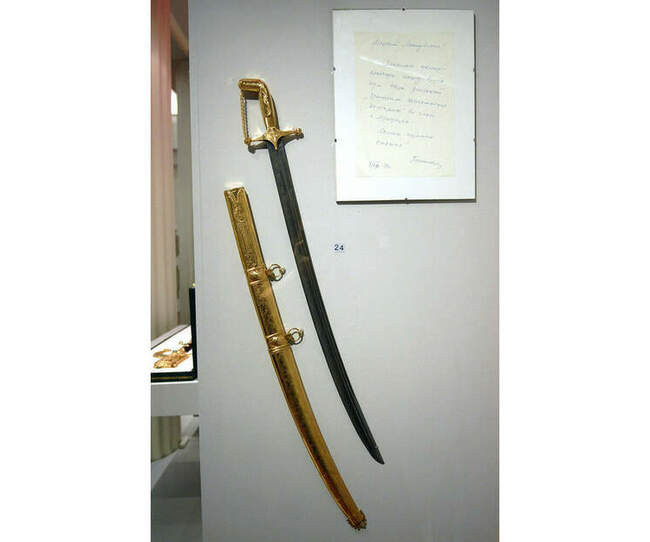 Узбекская шашка, подаренная Сталину. На ее ножнах были выгравированы строчки тюркского поэта Алишера Навои: «Кто хочет очистить мир от зла, вступает в битву тот за добрые дела, и меч в его руках безудержно суров, не знает никогда пощады для врагов».