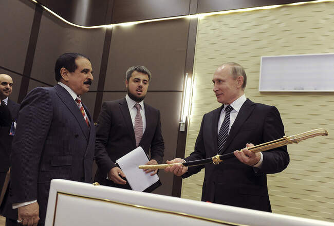Король Бахрейна Хамад II бен Иса аль-Халиф дарит президенту России Владимиру Путину меч из дамасской стали в 2016 году.