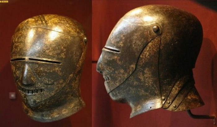 Этот шлем - один из самых знаменитых. В 1514 году император Священной Римской Империи Максимилиан I подарил Генриху VIII Тюдору, королю Англии, «костюмный» доспех, частью которого и являлся этот «рогатый» шлем. К сожалению, кроме шлема от этих доспехов больше ничего не сохранилось.