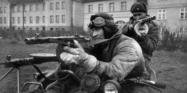 Советские автоматчики в Германии на мотоцикле «Харлей-Дэвидсон» с коляской от советского М-72 и пулемётом ДП-27