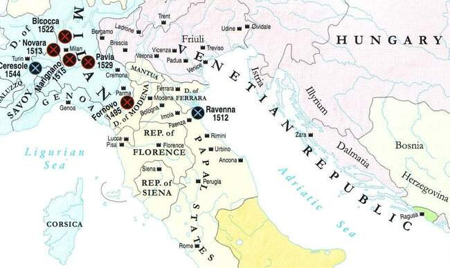 Карта Северной Италии с указанием главных сражений Итальянских войн.