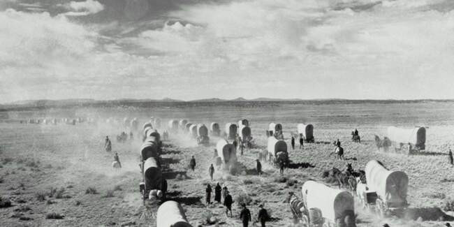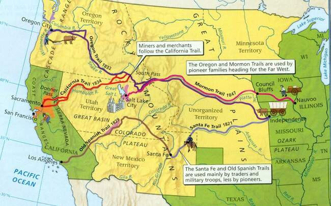 Постепенно переселенцы освоили Северную и Южную Дакоту, Монтану и Колорадо, Вайоминг и Небраску, Канзас и Орегон, а после американо-мексиканской войны — Калифорнию, Нью-Мексико и Техас. Колонизаторы двигались длинными караванами из гружёных фургонов, запряжённых лошадьми или быками, на запад от реки Миссисипи на Великие равнины и дальше, по долинам рек и индейским тропам. Одна за другой появлялись деревни, которые затем становились городами. Основными историческими путями стали Калифорнийская тропа (8 тыс. км от Миссури до Калифорнии; только с 1848 по 1869 г. по ней пришло в Калифорнию около 250 тыс. человек, а потом к полуострову построили железную дорогу), Орегонская тропа (3200 км), Мормонская тропа (2092 км) и тропа Санта-Фе.