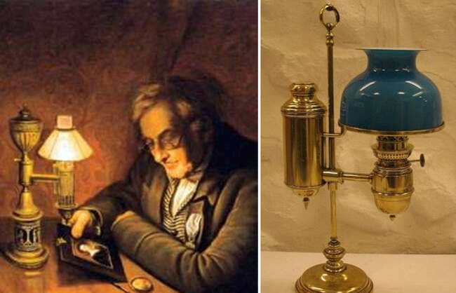 «Портер Джеймса Пила», 1822 год. Художник – его брат, Чарльз Уилсон Пил / Справа - латунная керосиновая лампа (конец XIX века)