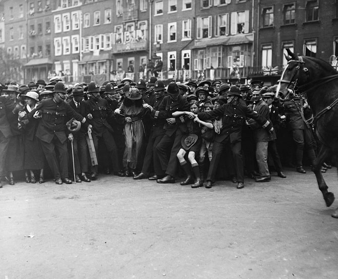 Полицейские сдерживают зрителей на параде в Лондоне. Июль 1919 года.