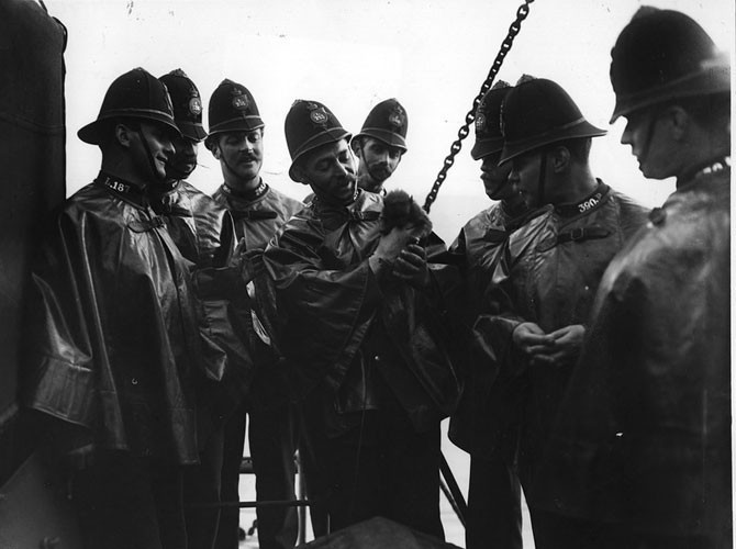 Полицейские нашли обезьянку на одном из судов во время общей транспортной забастовки. 31 мая 1912 года.