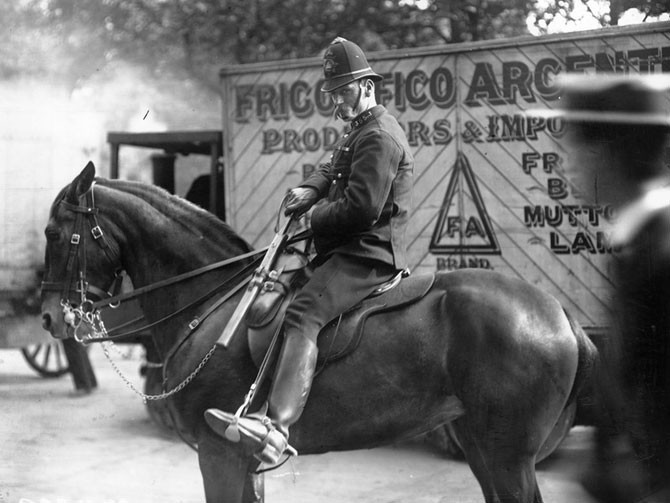 Конный полицейский возле мясного рынка Смитфилд во время забастовки транспортных рабочих. 1912 год.