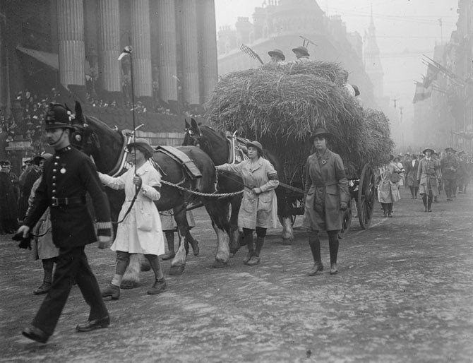 Полисмен сопровождает селян на шоу Лонда Майора в Лондоне. Ноябрь 1917 года.