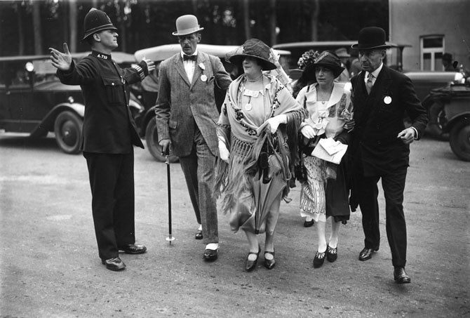 Полицейский помогает перейти дорогу зрителям скачек лондонском районе Гудвуд, 27 июля 1926 года.