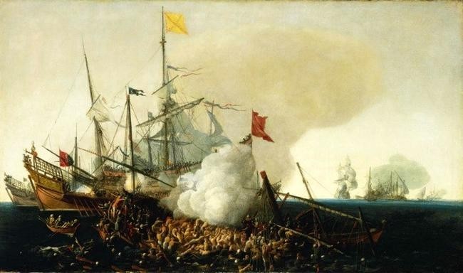 Испанские корабли сражаются с берберийскими корсарами. Картина: Корнелис Хендрикс Вром.
