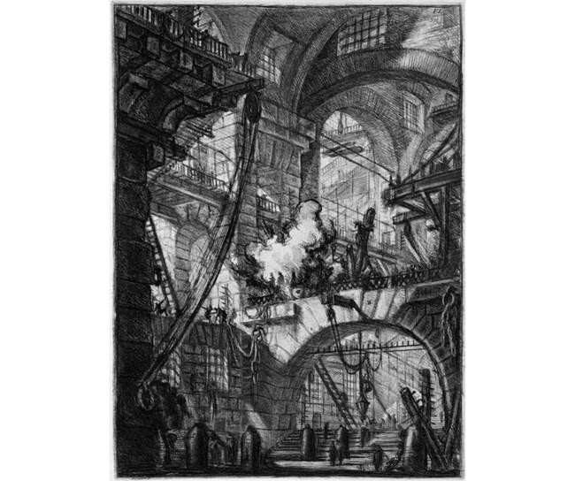 …Под мощными нависающими сводами располагаются странные пространства-лабиринты. Их назначение не так-то просто понять: то ли фрагменты циклопических дворцов, то ли экзотические пыточные из самых неприятных сновидений. Мосты прерываются посередине или ведут в темноту, лестницы — в никуда. Тяжелые блоки и брёвна, цепи и канаты усиливают ощущение чудовищности пространства. Кого-то пытают на дыбе, где-то оживают и сходят с барельефов львы, но едва ли не более страшным оказывается пространство, совсем лишённое фигур. Словно невидимо висит под этими гигантскими сводами нечто томительное и таинственное.