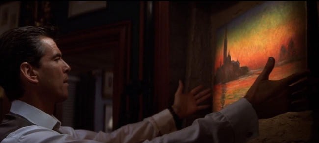 А эту картину в фильме заметит только самый преданный поклонник живописи. Камера ненадолго стыдливо отворачивается на расплывчатое изображение этого полотна, когда герои Броснана и Руссо выясняют свои отношения абсолютно голыми.