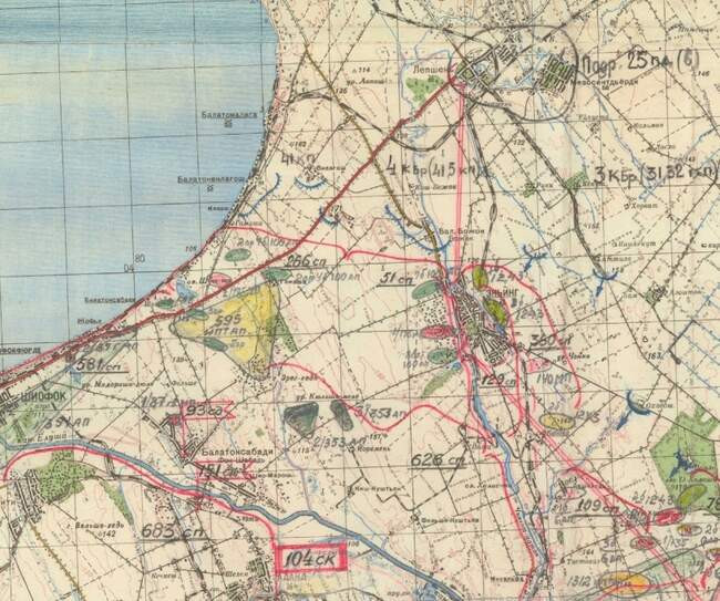 Фрагмент карты 3-го Украинского фронта с положением советских частей на вечер 8 декабря 1944 года. На побережье Балатона, где-то между селом Жофья и озером Шош-то был брошен «Королевский Тигр» №13