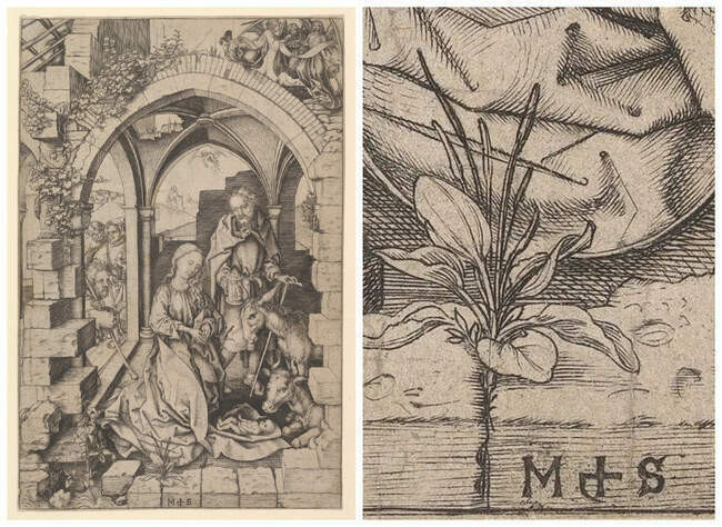 Мартин Шонгауэр. Рождество и Монограмма Шонгауэра на гравюре «Рождество»