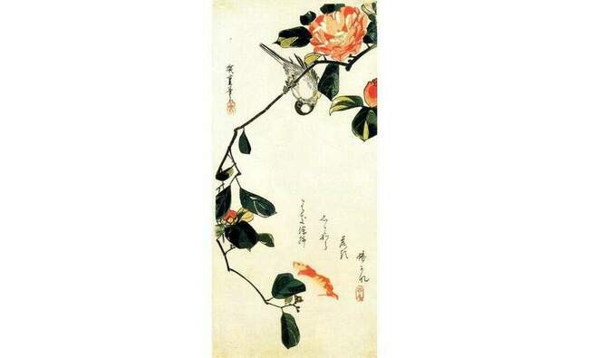 Жанр японской гравюры, посвященный изображению птиц и цветов, носит название катё-га. Сюда птицы залетели, чтобы подчеркнуть красоту гвоздик, мака и клевера.