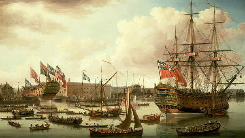 Спуск на воду корабля на верфи в Дептфорде. Художник Джон Клевели-старший.