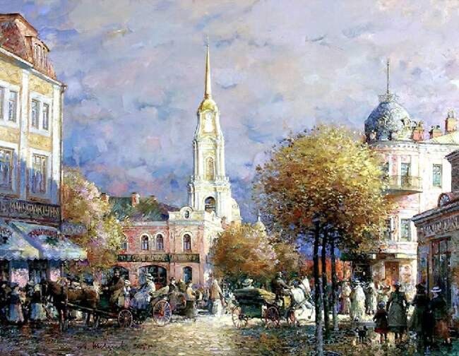 В творчестве Александра Шевелева есть еще один конек, делающий его живопись уникальной и незабываемой – это серия городских пейзажей, посвященных Рыбинску дореволюционного времени. В этом цикле живописец стремился отразить ту, канувшую в небытие, атмосферу провинциального города, который являлся одним из красивейших на Волге. А еще донести до зрителя романтизм ушедшей эпохи и, казалось бы, навсегда утраченный уклад жизни горожан того периода.