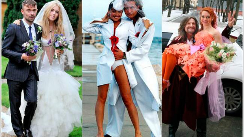 Эпатаж - это про них. Союз российской спортсменки Марины Анисиной и актера Никиты Джигурды всегда привлекал внимание общественности. И в день своей свадьбы эта пара заставила говорить о себе. Рыжеволосая невеста также решила отказаться от классического наряда. Для торжества она выбрала ажурное платье персикового цвета и пурпурные туфли и фату. Завершили образ ярко-оранжевые колготки.