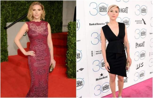 Американская актриса, которая стала известна благодаря участию в фильмах Вуди Аллена и роли Черной Вдовы в серии фильмов кинематографической вселенной Marvel, является счастливой обладательницей фигуры «песочные часы». Так как Скарлетт привыкла держать себя в форме, она вполне может себе позволить появляться на публике в облегающих платьях, подчеркивающих красивые изгибы ее фигуры. И Йоханссон этим активно пользуется. Также в ее гардеробе присутствуют костюмы с V-образным вырезом и разрезом, который делает акцент на стройных ногах – в подобной одежде актриса выглядит еще более привлекательно.