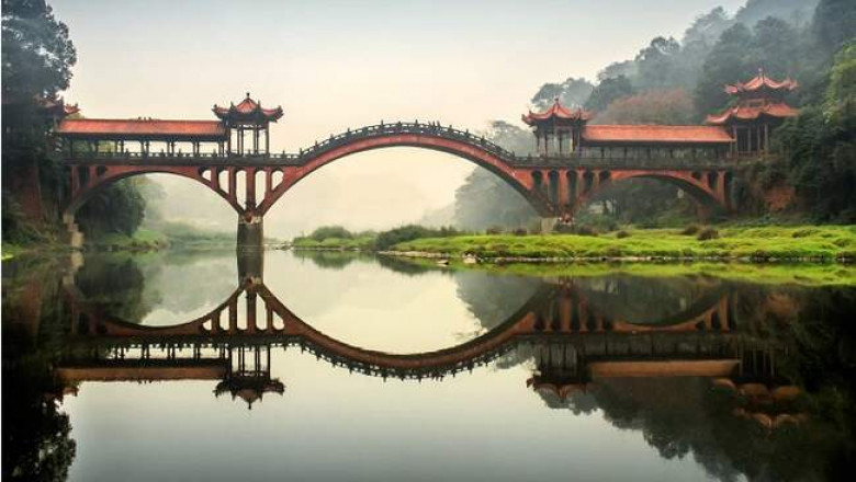 Мост не всегда может порадовать идеальным отражением, а вот красота архитектурных форм впечатляет (Эмэйшань, Китай).