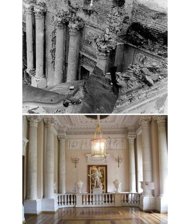 Одна из самых больших культурологических потерь Второй мировой войны - бесследно пропавшая Янтарная комната из Екатерининского дворца. Лишь в 2000-х в Россию вернулись ее небольшие фрагменты, но основную часть пришлось полностью воссоздавать - работы завершились в 2003 году.