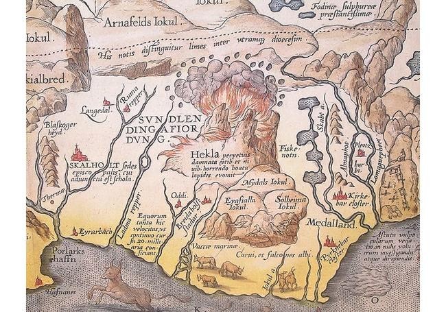 Детальная карта Исландии 1585 года Абрахама Ортелия показывает Геклу в извержении.
