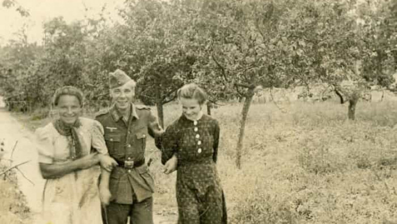 Немецкие солдаты с девушкой. СССР, Украина, 1942 год.