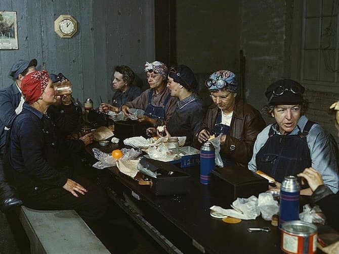 29-летняя Люсиль Мазурек, бывшая домохозяйка, чей муж был призван в армию, работает на заводе в Милуоки, штат Висконсин, февраль 1943 года. Фотограф Говард Холлем
