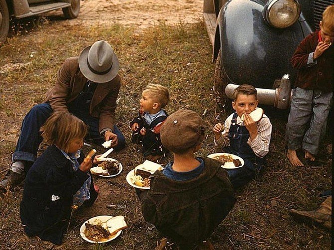 Фермер с детьми на барбекю, Пай-Таун, Нью-Мексико, октябрь 1940 года. Фотограф Ли Рассел