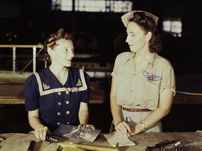 Вирджиния Янг (справа), руководитель ремонтного цеха на военно-морской базе в Техасе. Ее муж стал одной из первых жертв США во Второй мировой войне. Август 1941 года, фотограф Говард Холлем.