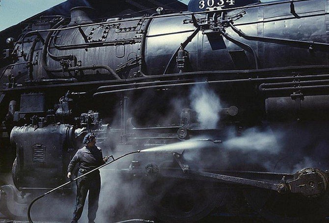 Не женская работа: Виола Сиверс моет локомотив серии H в Клинтоне, штат Айова, апрель 1943 года