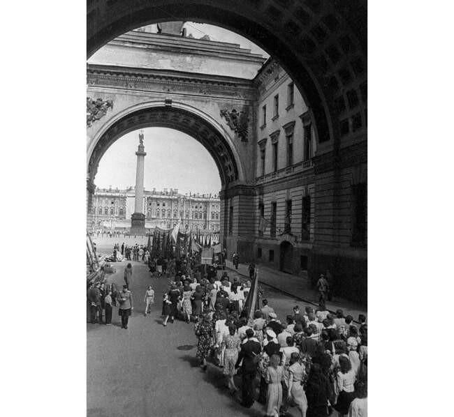 Колонна демонстрантов проходит под Триумфальной аркой главного штаба в Ленинграде.