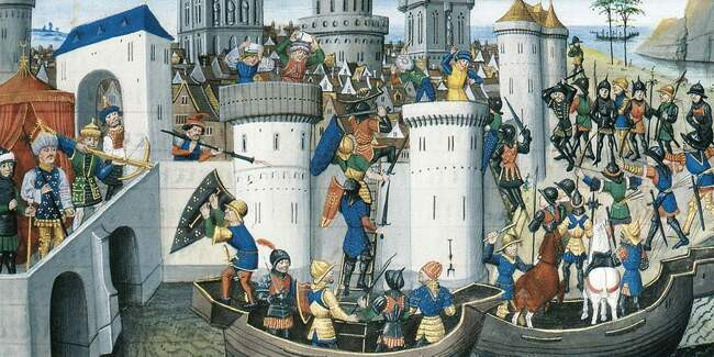 «И вот как был взят Царьград великий: подогнало ветром корабль к городской стене, и были огромные лестницы на нём выше стен, а короткие — на уровне заборол, и стреляли фряги с высоких лестниц по грекам и варягам, оборонявшим городские стены, камнями, и стрелами, и сулицами, а с коротких — перелезли на стену и так овладели городом».
