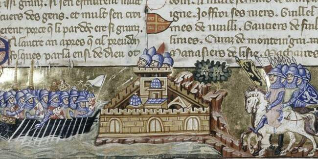 «Между тем волны опять отнесли неф, и он опять ударился об эту башню; и в то время, когда корабль снова и снова прибивало к башне, один из двух рыцарей — его имя было Андрэ де Дюрбуаз — поступает не иначе, как ухватывается ногами и руками за эту деревянную башню и ухитряется ползком пробраться в неё», — отметил уже знакомый нам Робер де Клари.
