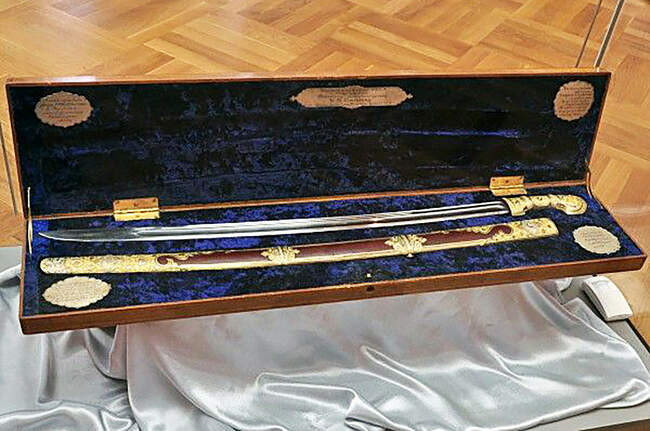 Сабля, подаренная императору Александру I в ходе его визита в Англию в 1814 году. Это оружие было сделано из метеорита, найденного в Южной Африке в конце 18 века.