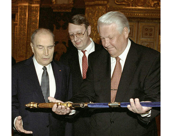 Президент РФ Борис Ельцин принимает в подарок старинный французский меч в ножнах от Президента Франции Франсуа Миттерана (слева) в честь 50-летнего юбилея Дня Победы во время торжественного приема в Кремле в 1995 году.