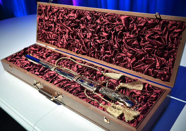 Король Бахрейна Хамад II бен Иса аль-Халиф дарит президенту России Владимиру Путину меч из дамасской стали в 2016 году.