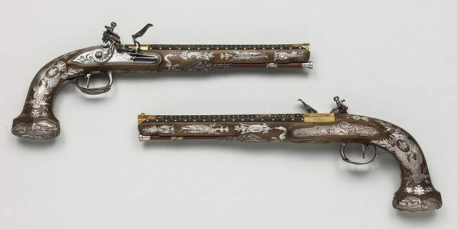 Пара парадных мушкетов, подаренных англичанами царю Михаилу Федоровичу в 1626 году на свадьбу.