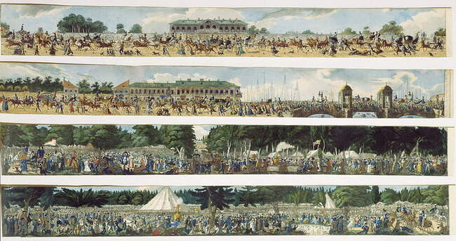 Ему принадлежит знаменитая гравюра «Гулянье в Екатерингофе», которая выполнена на длинной бумажной ленте – длина ее составляет десять метров, а высота – всего чуть больше девяти сантиметров. Такое гулянье проходило ежегодно 1 мая – от Калинкина моста в Петербурге ко дворцу в Екатерингофе.