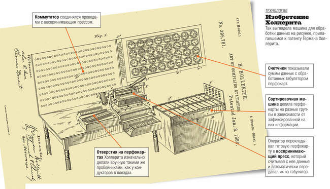 Инженер Герман Холлерит, выходец из семьи немецких иммигрантов, поступил на работу в бюро незадолго до переписи 1880 года. Работа по составлению таблиц и анализу данных после ее завершения обещала затянуться на несколько лет. Чиновники нервничали и искали технические решения. Высокопоставленный сотрудник бюро Чарлз Ситон предложил простое устройство: ящик с бумажными лентами на катушках; на лентах операторы вручную ставили отметки о наличии того или иного признака у опрошенных. Но изобретение Ситона упростило задачу ненамного. Обработка данных переписи 1880 года продлилась почти до старта следующей. Все понимали, что перепись 1890-го потребует еще больше времени и денег, и Холлерит тоже искал выход из положения. Решение наметилось после упомянутой беседы с Джоном Биллингсом в августе 1881 года. Тот для наглядности сослался на принципы устройства ткацкого станка Жаккара, и эта мысль крепко засела в мозгу Холлерита.